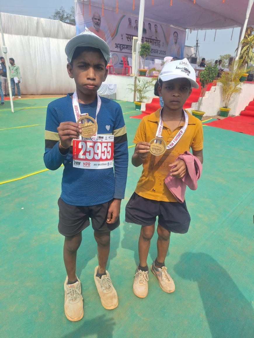 नारायणपुर, 03 मार्च 2025 // छत्तीसगढ़ के नारायणपुर जिले में आयोजित अबूझमाड़ पीस हाफ मैराथन 2025 ने खेल और साहस का नया अध्याय लिखा। 2 मार्च, रविवार को हुए इस भव्य आयोजन में देश-विदेश के धावकों ने बढ़-चढ़कर हिस्सा लिया। करीब 11 हजार से अधिक प्रतिभागियों ने इस मैराथन में भाग लिया, लेकिन इस दौड़ का केंद्र बने बालक छात्रावास नारायणपुर के दो नन्हे प्रतिभागी—छठवीं कक्षा के छात्र सुमेंद्र चक्रधारी और सौरभ पोटाई। महज 12 वर्ष की उम्र में इन दोनों बालकों ने 21 किलोमीटर की मैराथन दौड़ पूरी कर सबको चौंका दिया। उनके इस साहसिक प्रदर्शन से प्रभावित होकर वन मंत्री श्री केदार कश्यप और विधायक श्री अनुज शर्मा ने उन्हें सम्मानित करने की घोषणा की। मंत्री की घोषणा के बाद कलेक्टर प्रतिष्ठा ममगाईं ने दोनों बालकों को 30-30 हजार रुपए के चैक प्रदान कर उनका हौसला बढ़ाया।