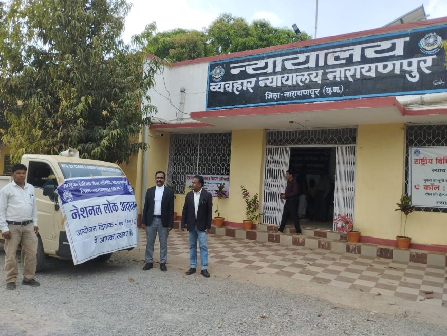 नारायणपुर, 04 मार्च 2025 // जिला न्यायाधीश एवं अध्यक्ष जिला विधिक सेवा प्राधिकरण कोण्डागांव उत्तरा कुमार कश्यप के निर्देशानुसार एवं सचिव जिला विधिक सेवा प्राधिकरण कोण्डागांव गायत्री साय, अपर सत्र न्यायाधीश नारायणपुर हरेंद्रसिंह नाग, मुख्य न्यायिक मजिस्ट्रेट एवं अध्यक्ष तालुका विधिक सेवा समिति प्रतिभा मरकाम के मार्गदर्शन में तथा रिटेनर अधिवक्ता चन्द्र प्रकाश कश्यप प्रबंधन कार्यालय के नेतृत्व मे अधिकार मित्र घासीराम नेताम, संदीप भगत के सहयोग से 08 मार्च को आयोजित होने वाले नेशनल लोक अदालत के संबंध में ग्राम पंचायत बकुलवाही, बेलगांव, कुकड़ाझोर, महका, बिंजली, शुभ गांव, गरांजी, दुग्गाबेंगाल, गुरीया, शांति नगर, और नारायणपुर शहर वासियों को जानकारी दी गई तथा नेशनल लोक अदालत के संबंध में चलित वाहन के द्वारा प्रचार-प्रसार किया गया और नगर के विभिन्न वार्ड में प्रचार-प्रसार मुनियादी एवं पाम्पलेट वितरण कर लोगो को बताया गया कि न्यायालय में लंबित राजीनामा योग्य प्रकरणों को आपसी राजीनामा के माध्यम से निराकरण किया जाता है। साथ ही सिविल, दाण्डिक, चेक, बाउंस पारिवारिक विवाद, श्रम, मोटर दुर्घटना दावा के प्रकरणों, बैंक के प्री-लीटिगेशन प्रकरण, बीमा, विधुत, दूरभाष, डाकघर एवं नगर पालिका का भी निराकरण किया जाता है। नेशनल लोक अदालत में निराकृत प्रकरणों के पारित अवार्ड एवं आदेश की प्रतिलिपि पक्षकारों को निःशुल्क प्रदाय किया जाता है।