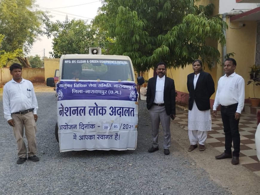नारायणपुर, 03 मई 2025 माननीया श्रीमती किरण चतुर्वेदी जिला न्यायाधीश/अध्यक्ष जिला विधिक सेवा प्राधिकरण कोण्डागांव के आदेशानुसार एवं सुश्री गायत्री साय सचिव जिला विधिक सेवा प्राधिकरण कोण्डागांव, श्रीमान हरेंद्रसिंह नाग अपर सत्र न्यायाधीश नारायणपुर, कुमारी प्रतिभा मरकाम मुख्य न्यायिक मजिस्ट्रेट व अध्यक्ष तालुका विधिक सेवा समिति नारायणपुर के मार्गदर्शन में एवं श्री चन्द्र प्रकाश कश्यप रिटेनर अधिवक्ता नारायणपुर प्रबंधन कार्यालय** के नेतृत्व मे अधिकार मित्र घासीराम नेताम के सहयोग से 10 मई को आयोजित होने वाले नेशनल लोक अदालत के संबंध में ग्राम पंचायत बड़े जम्हरी , बकुलवाही, बेलगांव, कुकड़ाझोर,माहका, बिंजली, सुपगांव, गरांजी, दुग्गाबेंगाल, गुरीया, शांति नगर, और नारायणपुर शहर वासियों को जानकारी दी गई। तथा नेशनल लोक अदालत के संबंध में चलित वाहन के द्वारा प्रचार प्रसार किया गया और नगर के विभिन्न वार्ड में प्रचार-प्रसार मुनियादी एवं पाम्पलेट वितरण कर लोगो को बताया गया कि न्यायालय में लंबित राजीनामा योग्य प्रकरणों को आपसी राजीनामा के माध्यम से निराकरण किया जाता है। साथ ही सिविल, दाण्डिक, चेक, बाउंस पारिवारिक विवाद, श्रम, मोटर दुर्घटना दावा के प्रकरणों, बैंक के प्री-लीटिगेशन प्रकरण, बीमा, विधुत, दूरभाष, डाकघर एवं नगर पालिका का भी निराकरण किया जाता है। नेशनल लोक अदालत में निराकृत प्रकरणों के पारित अवार्ड/आदेश की प्रतिलिपि पक्षकारों को निःशुल्क प्रदाय किया जाता है।