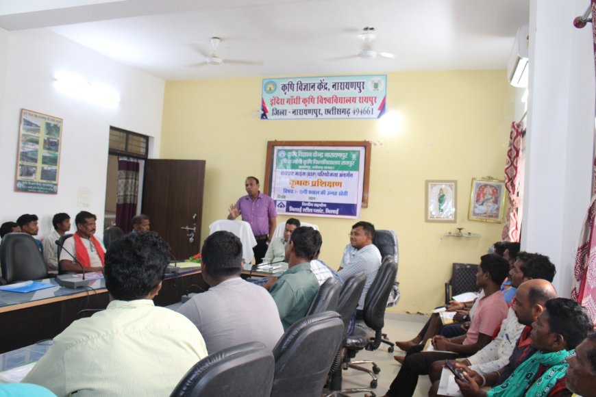 नारायणपुर, 18 जून 2025 18 जून को भिलाई इस्पात संयंत्र की रावघाट परियोजना के तहत कृषि विज्ञान केंद्र द्वारा नारायणपुर जिला के रावघाट गोद गाँव के कृषकों को रागी की उन्नत खेती पर 2 दिवसीय प्रशिक्षण दिया गया, इस अवसर पर मुख्य अथिति के रूप में बी.एस.पी. के सहायक महा प्रबंधक संजय रंगारी उपस्थित थे। के.वी.के. प्रमुख डॉ. दिब्येंदु दास द्वारा प्राकृतिक खेती के अंतर्गत विभिन्न घटकों जैसे बिजामृत, घन जीवामृत, जीवामृत आदि के निर्माण के बारे में विस्तृत जानकारी दी। मनीष कुमार वर्मा विषय वस्तु विशेषज्ञ द्वारा रागी उत्पादन तकनीक के बारे में जानकारी प्रदान की। कार्यक्रम सहायक पादप-रोग विज्ञान इंद्र कुमार द्वारा रागी में लगने वाले विभिन्न किट और रोगों के सम्बन्ध में जानकारी दी। इस अवसर पर रावघाट गोद गाँव के कुल 102 कृषक, बी.एस.पी. से अजय कुमार यदु एवं कृषि विज्ञान केंद्र के समस्त वैज्ञानिक एवं कर्मचारी उपस्थित थे।
