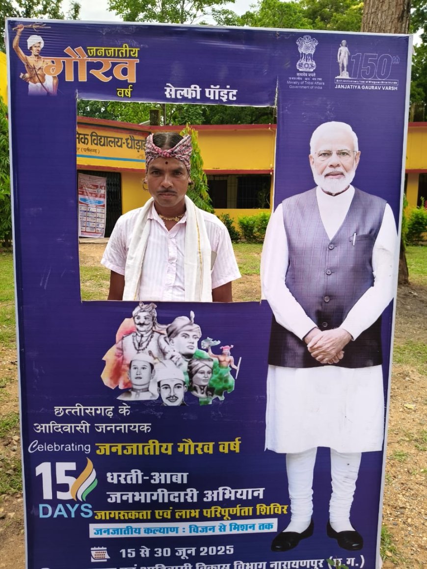 नारायणपुर, 28 जून 2025 कलेक्टर प्रतिष्ठा ममगाईं के निर्देशानुसार जिले में 30 जून 2025 तक धरती आबा जनभागीदारी अभियान के अंतर्गत राष्ट्रव्यापी जागरूकता सह लाभ संतृप्ति शिविर का आयोजन किया जा रहा है, जिसका उद्देश्य अंतिम व्यक्ति को पात्रता अनुसार व्यक्तिगत हक एवं लाभों से संतृप्त किया जाना है, जिसके तहत् 27 को धौड़ाई एवं 28 जून को धरती आबा जनभागीदारी अभियान के अंतर्गत जिले के ग्राम पंचायत कोहकमेटा में