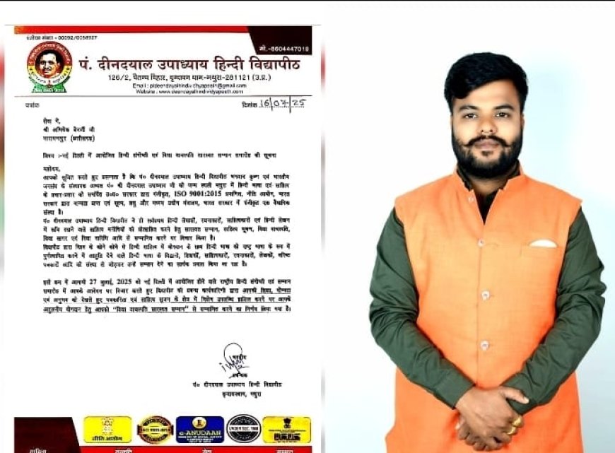बतादे, पंडित दीनदयाल उपाध्याय हिंदी विद्यापीठ वृंदावन धाम, मथुरा विश्वस्तर पर हिंदी भाषा के प्रचार-प्रसार के लिये विख्यात है भारतीय संस्कृति को हिंदी भाषा के माध्यम से विश्वपटल पर लाने में विद्यापीठ की अहम भूमिका रही है विद्यापीठ के कुलपति डॉ इंदु भूषण मिश्रा 'देवेंदु' ने विद्यापीठ की ओर से एक पत्र जारी करते हुए नारायणपुर जिले के हिंदी भाषा के युवा पत्रकार अभिषेक बेनर्जी को सूचित किया कि विश्व हिंदी दिवस 27 जुलाई को नई दिल्ली में आयोजित होने वाले विद्यापीठ के भव्य कार्यक्रम में श्री बेनर्जी को हिंदी भाषा मे उत्कृष्ट पत्रकारिता, हिंदी साहित्य सृजन के क्षेत्र में योगदान के लिये विधावाचस्पति अर्थात "डॉक्टरेट" की मानद उपाधि से सम्मानित किया जाएगा,यह उपाधि हिंदी भाषा में उत्कृष्ट पत्रकारिता एवं हिंदी साहित्य सृजन के क्षेत्र में विशेष योगदान के लिये दी जाती है,