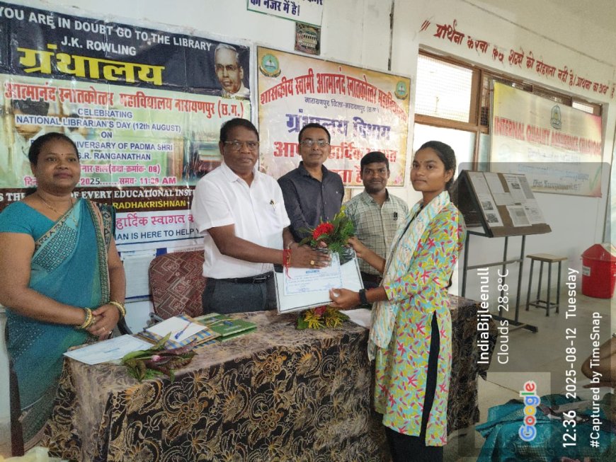 नारायणपुर, 12 अगस्त 2025 शासकीय स्वामी आत्मानन्द स्नातकोत्तर महाविद्यालय नारायणपुर के ग्रंथालय विभाग द्वारा भारत में पुस्तकालय विज्ञान के जनक डॉ.एस.आर. रंगनाथन के 133 वीं जन्म जयंती के अवसर पर प्रति वर्ष 12 अगस्त को नेशनल लाइब्रेरियन्स डे पूरे देश में मनाया जाता है। इस अवसर पर साहित्यिक प्रश्नावली प्रतियोगिता का आयोजन किया गया, जिसमें इंडिया डिवाइडेड, ठाकुर का कुआँ, सूरज का सातवां घोड़ा, इंडिया विंस फ्रीडम जैसे प्रसिद्ध पुस्तकों एवं उनके लेखकों के नाम तथा 2025 में बुकर पुरस्कार प्राप्त पुस्तक एवं उसके लेखक से संबंधित प्रश्न पूछे गए। इस अवसर पर महाविद्यालय के प्राचार्य डॉ. एस.आर. कुंजाम ने छात्र छात्राओं को छात्र जीवन मे लुक नही बल्कि बुक की ओर ज्यादा ध्यान देने को कहा और साथ ही यह भी बताया कि पुस्तकें ज्ञान प्राप्ति के मार्ग को प्रशस्त करती है और हमारे मन मस्तिष्क में तार्किक और विश्लेषणात्मक क्षमता का विकास करती है इसलिए समाज के प्रत्येक व्यक्ति को अपने रोजमर्रा के जीवन से कुछ समय निकालकर पुस्तकालयों में पुस्तकों के बीच अवश्य ही व्यतीत करना चाहिए।