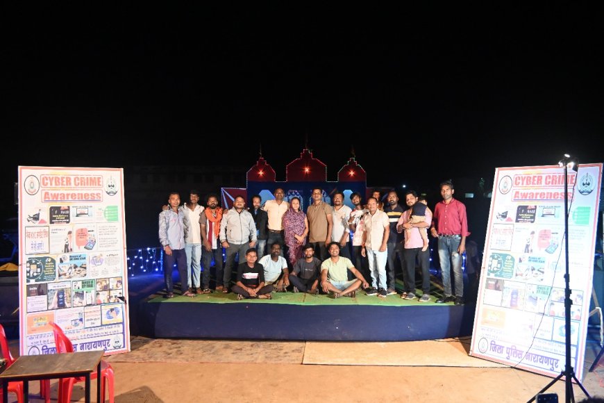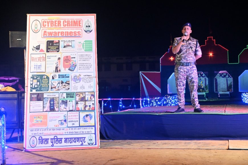 नारायणपुर साइबर पुलिस टीम द्वारा सामुदायिक पुलिसिंग के तहत "साइबर जागरूकता अभियान" चलाया जा रहा है। इस अभियान के तहत, पॉवर क्लब गणेशोत्सव समिति द्वारा आयोजित सांस्कृतिक कार्यक्रम स्थल बंगलापारा में 200 से अधिक नगरवासी, प्रतिभागी और गणेशोत्सव समिति के सदस्यों को साइबर अपराधों से बचने संबंधी जानकारी दी गई।