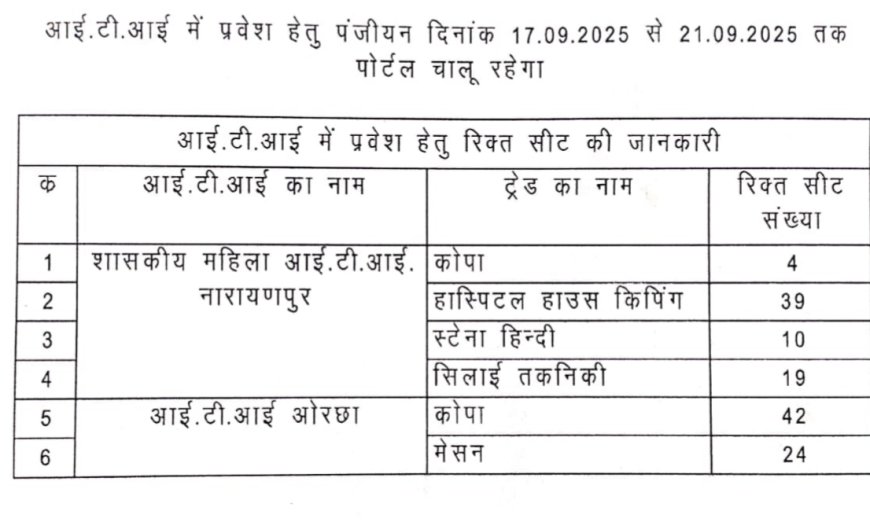नारायणपुर में आईटीआई प्रवेश के लिए पंजीयन प्रक्रिया शुरू हो गई है। आईटीआई में विभिन्न ट्रेडों में रिक्त सीटों की जानकारी निम्नलिखित है: