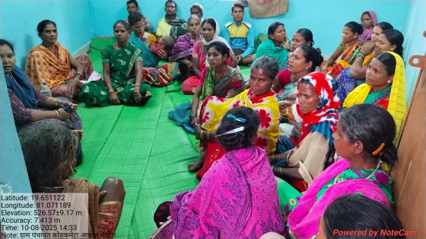 नारायणपुर, 09 अक्टूबर 2025 विकासखंड ओरछा के ग्राम पंचायत कोहकमेटा में “मावा नार मावा लोन (मेरा गांव मेरा आवास)” अभियान के तहत ग्राम की महिलाओं को प्रधानमंत्री आवास योजना (ग्रामीण) से संबंधित उन्मुखीकरण एवं जागरूकता दी गई। कार्यक्रम में महिलाओं को योजना की प्रक्रियाओं, पात्रता एवं निर्धारित समय सीमा में आवास निर्माण पूर्ण करने के लिए प्रेरित किया गया।