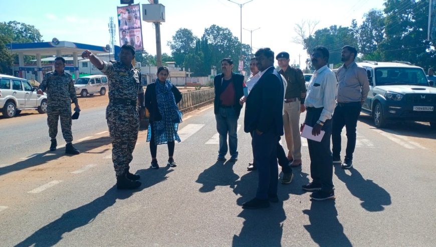नारायणपुर, 10 दिसम्बर 2025 शहर के दुर्घटनाजन्य स्थलों का कलेक्टर प्रतिष्ठा ममगाईं और पुलिस अधीक्षक रॉबिनसन गुड़िया द्वारा निरीक्षण कर लोक निर्माण विभाग के मुख्य कार्यपालन अभियंता संजय चौहान को गतिरोधक बनाने आवश्यक दिशा
