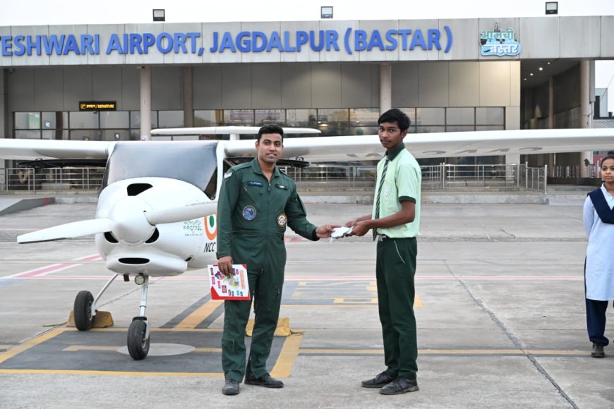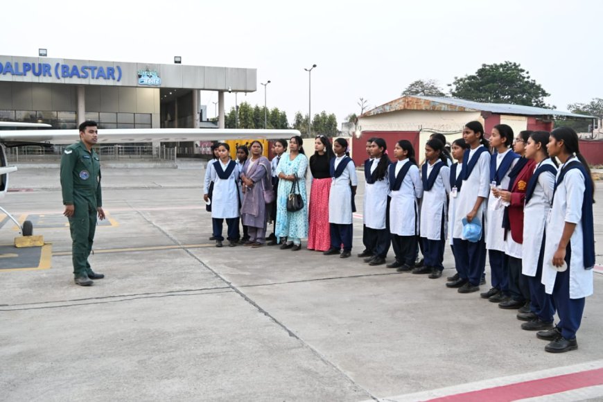 नारायणपुर, 22 फरवरी 2026 नारायणपुर जिले के सुदूर अंचलों के विद्यार्थियों के लिए शनिवार का दिन एक ऐतिहासिक उपलब्धि के रूप में दर्ज हुआ, जब जिला प्रशासन की विशेष पहल से माँ दन्तेश्वरी हवाई अड्डा, जगदलपुर में एक उच्च-स्तरीय शैक्षणिक भ्रमण का आयोजन किया गया। बस्तर के इतिहास में यह संभवतः पहला अवसर था, जब सामान्य स्कूली विद्यार्थियों को NCC एयर कैडेट्स की तर्ज पर व्यावहारिक 'फ्लाइंग एक्सपोजर' प्रदान किया गया ताकि वे विमानन की अत्याधुनिक तकनीक और रक्षा सेवाओं में करियर की संभावनाओं को प्रत्यक्ष रूप से समझ सकें।